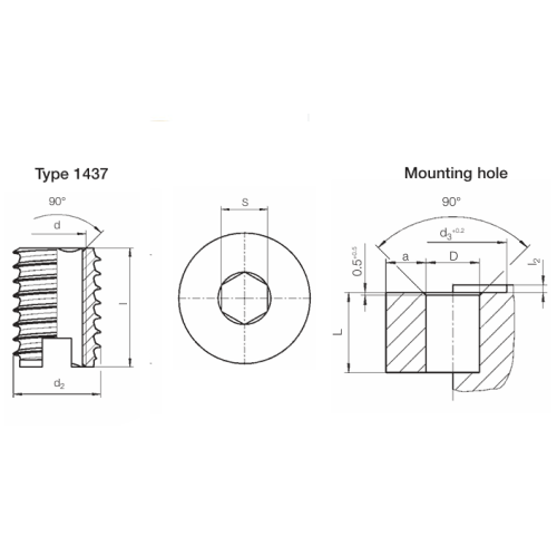 QUICKSERT® Hex consists of a cylindrical basic body with internal thread and additional internal hexagon and a special external thread. The profile of the external thread has an extremely small flank angle and expands asymmetrically towards the thread root. This way, installation at low driving torques is optimised.