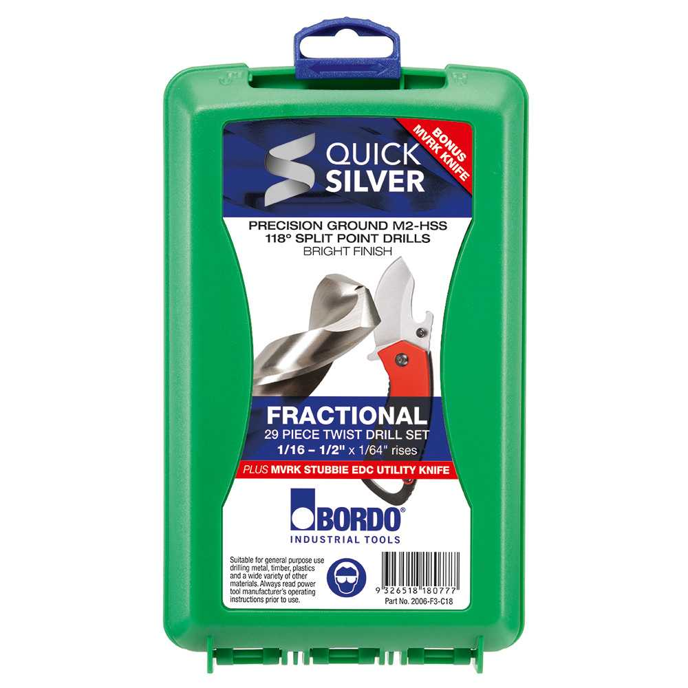 - Bordo Fractional 29 Piece Quick Silver M2-HSS Twist Drill Set – Bonus Stubbie Folding Knife